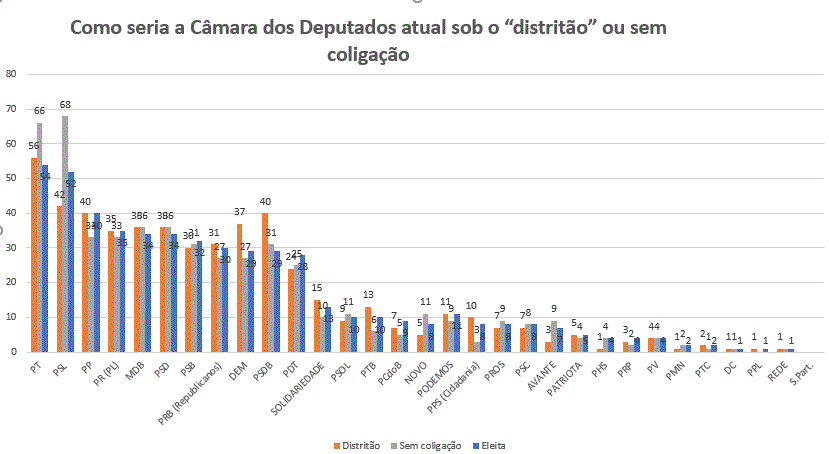 • os grandes beneficiários seriam apenas o PSL e o PT, no sistema proporcional sem a coligações, que passariam respectivamente dos atuais 52 para 68 e de 54 para 66;